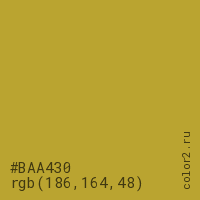 Цвет #BAA430 в цветовой модели RGB обозначается тремя октетами (186, 164, 48) в десятичном формате и #BAA430 в шестнадцатиричном (hex) формате, которые являются интенсивностью красного 186 (hex BA), интенсивность зелёного 164 (hex A4) и интенсивность синего 48 (hex 30).