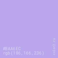 Цвет #BAA6EC в цветовой модели RGB обозначается тремя октетами (186, 166, 236) в десятичном формате и #BAA6EC в шестнадцатиричном (hex) формате, которые являются интенсивностью красного 186 (hex BA), интенсивность зелёного 166 (hex A6) и интенсивность синего 236 (hex EC).