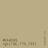Цвет #BAAD85 в цветовой модели RGB обозначается тремя октетами (186, 173, 133) в десятичном формате и #BAAD85 в шестнадцатиричном (hex) формате, которые являются интенсивностью красного 186 (hex BA), интенсивность зелёного 173 (hex AD) и интенсивность синего 133 (hex 85).