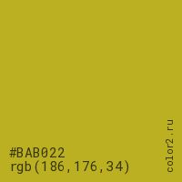 Цвет #BAB022 в цветовой модели RGB обозначается тремя октетами (186, 176, 34) в десятичном формате и #BAB022 в шестнадцатиричном (hex) формате, которые являются интенсивностью красного 186 (hex BA), интенсивность зелёного 176 (hex B0) и интенсивность синего 34 (hex 22).