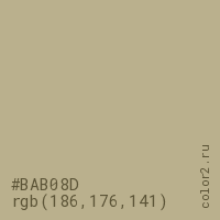 Цвет #BAB08D в цветовой модели RGB обозначается тремя октетами (186, 176, 141) в десятичном формате и #BAB08D в шестнадцатиричном (hex) формате, которые являются интенсивностью красного 186 (hex BA), интенсивность зелёного 176 (hex B0) и интенсивность синего 141 (hex 8D).