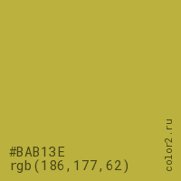 Цвет #BAB13E в цветовой модели RGB обозначается тремя октетами (186, 177, 62) в десятичном формате и #BAB13E в шестнадцатиричном (hex) формате, которые являются интенсивностью красного 186 (hex BA), интенсивность зелёного 177 (hex B1) и интенсивность синего 62 (hex 3E).