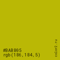 Цвет #BAB805 в цветовой модели RGB обозначается тремя октетами (186, 184, 5) в десятичном формате и #BAB805 в шестнадцатиричном (hex) формате, которые являются интенсивностью красного 186 (hex BA), интенсивность зелёного 184 (hex B8) и интенсивность синего 5 (hex 05).