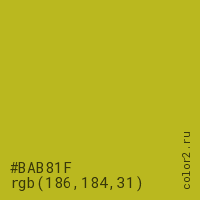 Цвет #BAB81F в цветовой модели RGB обозначается тремя октетами (186, 184, 31) в десятичном формате и #BAB81F в шестнадцатиричном (hex) формате, которые являются интенсивностью красного 186 (hex BA), интенсивность зелёного 184 (hex B8) и интенсивность синего 31 (hex 1F).