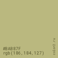 Цвет #BAB87F в цветовой модели RGB обозначается тремя октетами (186, 184, 127) в десятичном формате и #BAB87F в шестнадцатиричном (hex) формате, которые являются интенсивностью красного 186 (hex BA), интенсивность зелёного 184 (hex B8) и интенсивность синего 127 (hex 7F).