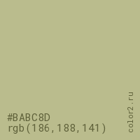Цвет #BABC8D в цветовой модели RGB обозначается тремя октетами (186, 188, 141) в десятичном формате и #BABC8D в шестнадцатиричном (hex) формате, которые являются интенсивностью красного 186 (hex BA), интенсивность зелёного 188 (hex BC) и интенсивность синего 141 (hex 8D).
