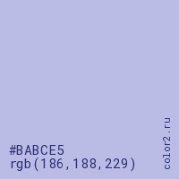 Цвет #BABCE5 в цветовой модели RGB обозначается тремя октетами (186, 188, 229) в десятичном формате и #BABCE5 в шестнадцатиричном (hex) формате, которые являются интенсивностью красного 186 (hex BA), интенсивность зелёного 188 (hex BC) и интенсивность синего 229 (hex E5).