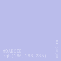 Цвет #BABCEB в цветовой модели RGB обозначается тремя октетами (186, 188, 235) в десятичном формате и #BABCEB в шестнадцатиричном (hex) формате, которые являются интенсивностью красного 186 (hex BA), интенсивность зелёного 188 (hex BC) и интенсивность синего 235 (hex EB).