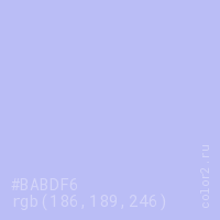 Цвет #BABDF6 в цветовой модели RGB обозначается тремя октетами (186, 189, 246) в десятичном формате и #BABDF6 в шестнадцатиричном (hex) формате, которые являются интенсивностью красного 186 (hex BA), интенсивность зелёного 189 (hex BD) и интенсивность синего 246 (hex F6).