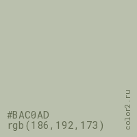 Цвет #BAC0AD в цветовой модели RGB обозначается тремя октетами (186, 192, 173) в десятичном формате и #BAC0AD в шестнадцатиричном (hex) формате, которые являются интенсивностью красного 186 (hex BA), интенсивность зелёного 192 (hex C0) и интенсивность синего 173 (hex AD).