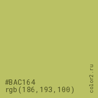 Цвет #BAC164 в цветовой модели RGB обозначается тремя октетами (186, 193, 100) в десятичном формате и #BAC164 в шестнадцатиричном (hex) формате, которые являются интенсивностью красного 186 (hex BA), интенсивность зелёного 193 (hex C1) и интенсивность синего 100 (hex 64).
