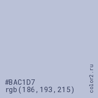 Цвет #BAC1D7 в цветовой модели RGB обозначается тремя октетами (186, 193, 215) в десятичном формате и #BAC1D7 в шестнадцатиричном (hex) формате, которые являются интенсивностью красного 186 (hex BA), интенсивность зелёного 193 (hex C1) и интенсивность синего 215 (hex D7).