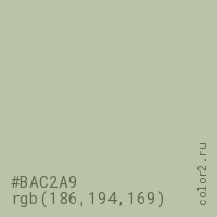 Цвет #BAC2A9 в цветовой модели RGB обозначается тремя октетами (186, 194, 169) в десятичном формате и #BAC2A9 в шестнадцатиричном (hex) формате, которые являются интенсивностью красного 186 (hex BA), интенсивность зелёного 194 (hex C2) и интенсивность синего 169 (hex A9).