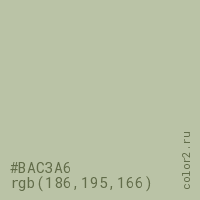 Цвет #BAC3A6 в цветовой модели RGB обозначается тремя октетами (186, 195, 166) в десятичном формате и #BAC3A6 в шестнадцатиричном (hex) формате, которые являются интенсивностью красного 186 (hex BA), интенсивность зелёного 195 (hex C3) и интенсивность синего 166 (hex A6).