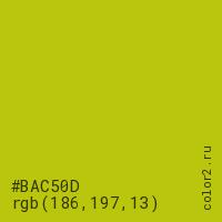 Цвет #BAC50D в цветовой модели RGB обозначается тремя октетами (186, 197, 13) в десятичном формате и #BAC50D в шестнадцатиричном (hex) формате, которые являются интенсивностью красного 186 (hex BA), интенсивность зелёного 197 (hex C5) и интенсивность синего 13 (hex 0D).