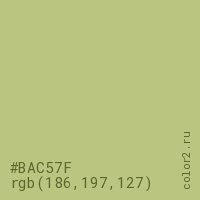 Цвет #BAC57F в цветовой модели RGB обозначается тремя октетами (186, 197, 127) в десятичном формате и #BAC57F в шестнадцатиричном (hex) формате, которые являются интенсивностью красного 186 (hex BA), интенсивность зелёного 197 (hex C5) и интенсивность синего 127 (hex 7F).