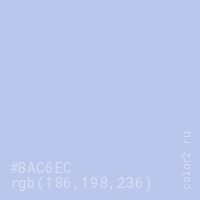 Цвет #BAC6EC в цветовой модели RGB обозначается тремя октетами (186, 198, 236) в десятичном формате и #BAC6EC в шестнадцатиричном (hex) формате, которые являются интенсивностью красного 186 (hex BA), интенсивность зелёного 198 (hex C6) и интенсивность синего 236 (hex EC).