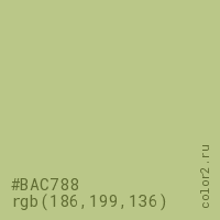 Цвет #BAC788 в цветовой модели RGB обозначается тремя октетами (186, 199, 136) в десятичном формате и #BAC788 в шестнадцатиричном (hex) формате, которые являются интенсивностью красного 186 (hex BA), интенсивность зелёного 199 (hex C7) и интенсивность синего 136 (hex 88).