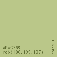 Цвет #BAC789 в цветовой модели RGB обозначается тремя октетами (186, 199, 137) в десятичном формате и #BAC789 в шестнадцатиричном (hex) формате, которые являются интенсивностью красного 186 (hex BA), интенсивность зелёного 199 (hex C7) и интенсивность синего 137 (hex 89).