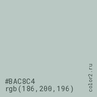 Цвет #BAC8C4 в цветовой модели RGB обозначается тремя октетами (186, 200, 196) в десятичном формате и #BAC8C4 в шестнадцатиричном (hex) формате, которые являются интенсивностью красного 186 (hex BA), интенсивность зелёного 200 (hex C8) и интенсивность синего 196 (hex C4).