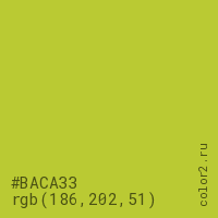 Цвет #BACA33 в цветовой модели RGB обозначается тремя октетами (186, 202, 51) в десятичном формате и #BACA33 в шестнадцатиричном (hex) формате, которые являются интенсивностью красного 186 (hex BA), интенсивность зелёного 202 (hex CA) и интенсивность синего 51 (hex 33).