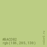 Цвет #BACD82 в цветовой модели RGB обозначается тремя октетами (186, 205, 130) в десятичном формате и #BACD82 в шестнадцатиричном (hex) формате, которые являются интенсивностью красного 186 (hex BA), интенсивность зелёного 205 (hex CD) и интенсивность синего 130 (hex 82).