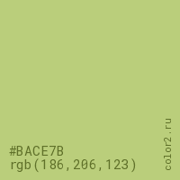 Цвет #BACE7B в цветовой модели RGB обозначается тремя октетами (186, 206, 123) в десятичном формате и #BACE7B в шестнадцатиричном (hex) формате, которые являются интенсивностью красного 186 (hex BA), интенсивность зелёного 206 (hex CE) и интенсивность синего 123 (hex 7B).