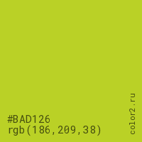 Цвет #BAD126 в цветовой модели RGB обозначается тремя октетами (186, 209, 38) в десятичном формате и #BAD126 в шестнадцатиричном (hex) формате, которые являются интенсивностью красного 186 (hex BA), интенсивность зелёного 209 (hex D1) и интенсивность синего 38 (hex 26).