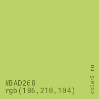 Цвет #BAD268 в цветовой модели RGB обозначается тремя октетами (186, 210, 104) в десятичном формате и #BAD268 в шестнадцатиричном (hex) формате, которые являются интенсивностью красного 186 (hex BA), интенсивность зелёного 210 (hex D2) и интенсивность синего 104 (hex 68).