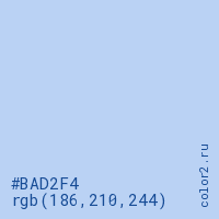 Цвет #BAD2F4 в цветовой модели RGB обозначается тремя октетами (186, 210, 244) в десятичном формате и #BAD2F4 в шестнадцатиричном (hex) формате, которые являются интенсивностью красного 186 (hex BA), интенсивность зелёного 210 (hex D2) и интенсивность синего 244 (hex F4).