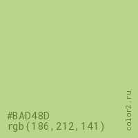 Цвет #BAD48D в цветовой модели RGB обозначается тремя октетами (186, 212, 141) в десятичном формате и #BAD48D в шестнадцатиричном (hex) формате, которые являются интенсивностью красного 186 (hex BA), интенсивность зелёного 212 (hex D4) и интенсивность синего 141 (hex 8D).