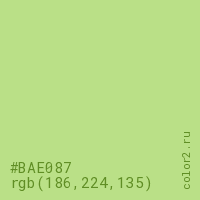 Цвет #BAE087 в цветовой модели RGB обозначается тремя октетами (186, 224, 135) в десятичном формате и #BAE087 в шестнадцатиричном (hex) формате, которые являются интенсивностью красного 186 (hex BA), интенсивность зелёного 224 (hex E0) и интенсивность синего 135 (hex 87).