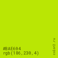 Цвет #BAE604 в цветовой модели RGB обозначается тремя октетами (186, 230, 4) в десятичном формате и #BAE604 в шестнадцатиричном (hex) формате, которые являются интенсивностью красного 186 (hex BA), интенсивность зелёного 230 (hex E6) и интенсивность синего 4 (hex 04).