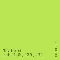 Цвет #BAE653 в цветовой модели RGB обозначается тремя октетами (186, 230, 83) в десятичном формате и #BAE653 в шестнадцатиричном (hex) формате, которые являются интенсивностью красного 186 (hex BA), интенсивность зелёного 230 (hex E6) и интенсивность синего 83 (hex 53).