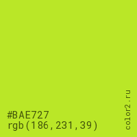 Цвет #BAE727 в цветовой модели RGB обозначается тремя октетами (186, 231, 39) в десятичном формате и #BAE727 в шестнадцатиричном (hex) формате, которые являются интенсивностью красного 186 (hex BA), интенсивность зелёного 231 (hex E7) и интенсивность синего 39 (hex 27).