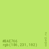 Цвет #BAE766 в цветовой модели RGB обозначается тремя октетами (186, 231, 102) в десятичном формате и #BAE766 в шестнадцатиричном (hex) формате, которые являются интенсивностью красного 186 (hex BA), интенсивность зелёного 231 (hex E7) и интенсивность синего 102 (hex 66).