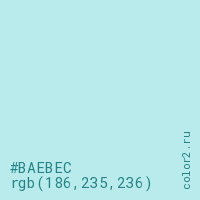 Цвет #BAEBEC в цветовой модели RGB обозначается тремя октетами (186, 235, 236) в десятичном формате и #BAEBEC в шестнадцатиричном (hex) формате, которые являются интенсивностью красного 186 (hex BA), интенсивность зелёного 235 (hex EB) и интенсивность синего 236 (hex EC).
