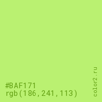 Цвет #BAF171 в цветовой модели RGB обозначается тремя октетами (186, 241, 113) в десятичном формате и #BAF171 в шестнадцатиричном (hex) формате, которые являются интенсивностью красного 186 (hex BA), интенсивность зелёного 241 (hex F1) и интенсивность синего 113 (hex 71).