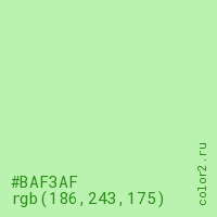 Цвет #BAF3AF в цветовой модели RGB обозначается тремя октетами (186, 243, 175) в десятичном формате и #BAF3AF в шестнадцатиричном (hex) формате, которые являются интенсивностью красного 186 (hex BA), интенсивность зелёного 243 (hex F3) и интенсивность синего 175 (hex AF).