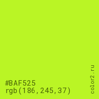 Цвет #BAF525 в цветовой модели RGB обозначается тремя октетами (186, 245, 37) в десятичном формате и #BAF525 в шестнадцатиричном (hex) формате, которые являются интенсивностью красного 186 (hex BA), интенсивность зелёного 245 (hex F5) и интенсивность синего 37 (hex 25).