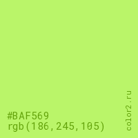 Цвет #BAF569 в цветовой модели RGB обозначается тремя октетами (186, 245, 105) в десятичном формате и #BAF569 в шестнадцатиричном (hex) формате, которые являются интенсивностью красного 186 (hex BA), интенсивность зелёного 245 (hex F5) и интенсивность синего 105 (hex 69).