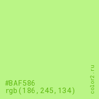 Цвет #BAF586 в цветовой модели RGB обозначается тремя октетами (186, 245, 134) в десятичном формате и #BAF586 в шестнадцатиричном (hex) формате, которые являются интенсивностью красного 186 (hex BA), интенсивность зелёного 245 (hex F5) и интенсивность синего 134 (hex 86).