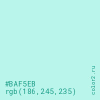 Цвет #BAF5EB в цветовой модели RGB обозначается тремя октетами (186, 245, 235) в десятичном формате и #BAF5EB в шестнадцатиричном (hex) формате, которые являются интенсивностью красного 186 (hex BA), интенсивность зелёного 245 (hex F5) и интенсивность синего 235 (hex EB).