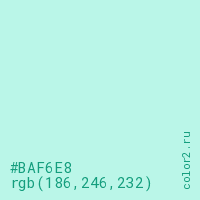 Цвет #BAF6E8 в цветовой модели RGB обозначается тремя октетами (186, 246, 232) в десятичном формате и #BAF6E8 в шестнадцатиричном (hex) формате, которые являются интенсивностью красного 186 (hex BA), интенсивность зелёного 246 (hex F6) и интенсивность синего 232 (hex E8).