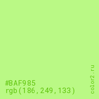 Цвет #BAF985 в цветовой модели RGB обозначается тремя октетами (186, 249, 133) в десятичном формате и #BAF985 в шестнадцатиричном (hex) формате, которые являются интенсивностью красного 186 (hex BA), интенсивность зелёного 249 (hex F9) и интенсивность синего 133 (hex 85).