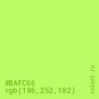 Цвет #BAFC66 в цветовой модели RGB обозначается тремя октетами (186, 252, 102) в десятичном формате и #BAFC66 в шестнадцатиричном (hex) формате, которые являются интенсивностью красного 186 (hex BA), интенсивность зелёного 252 (hex FC) и интенсивность синего 102 (hex 66).