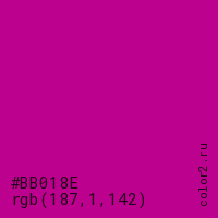 Цвет #BB018E в цветовой модели RGB обозначается тремя октетами (187, 1, 142) в десятичном формате и #BB018E в шестнадцатиричном (hex) формате, которые являются интенсивностью красного 187 (hex BB), интенсивность зелёного 1 (hex 01) и интенсивность синего 142 (hex 8E).