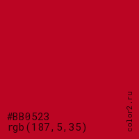 Цвет #BB0523 в цветовой модели RGB обозначается тремя октетами (187, 5, 35) в десятичном формате и #BB0523 в шестнадцатиричном (hex) формате, которые являются интенсивностью красного 187 (hex BB), интенсивность зелёного 5 (hex 05) и интенсивность синего 35 (hex 23).