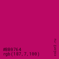 Цвет #BB0764 в цветовой модели RGB обозначается тремя октетами (187, 7, 100) в десятичном формате и #BB0764 в шестнадцатиричном (hex) формате, которые являются интенсивностью красного 187 (hex BB), интенсивность зелёного 7 (hex 07) и интенсивность синего 100 (hex 64).