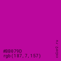 Цвет #BB079D в цветовой модели RGB обозначается тремя октетами (187, 7, 157) в десятичном формате и #BB079D в шестнадцатиричном (hex) формате, которые являются интенсивностью красного 187 (hex BB), интенсивность зелёного 7 (hex 07) и интенсивность синего 157 (hex 9D).